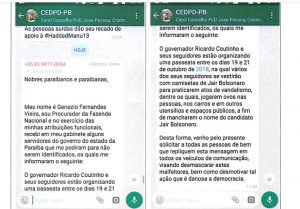 Meu nome é Luís Tôrres, sou Secretario de Comunicação Institucional do Estado da Paraíba e no exercício das minhas atribuições funcionais tomei conhecimento de mensagem encaminhada por meio de grupos de whatsapp pelo procurador da Fazenda, Genezio Fernandes Vieira, dando conta de que havia recebido supostos servidores do Estado “denunciando” que o governador Ricardo Coutinho estaria convocando gente para se infiltrar em manifestações em favor da candidatura do presidenciável Jair Bolsonaro para praticar vandalismos e, consequetemente, transferir as responsabilidades aos simpatizantes do candidato.