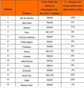 Hospedagem – O levantamento foi realizado com base em buscas por hospedagens realizadas no kayak.com.br e seus sites associados no período de 01/02/2025 a 31/07/2025, para viagens entre 01/09/2025 e 15/11/2025. Os preços médios são para uma diária em quarto duplo, para todas as classificações de estrela combinadas (de 1 a 5), e podem variar com o tempo. A economia não é garantida.
